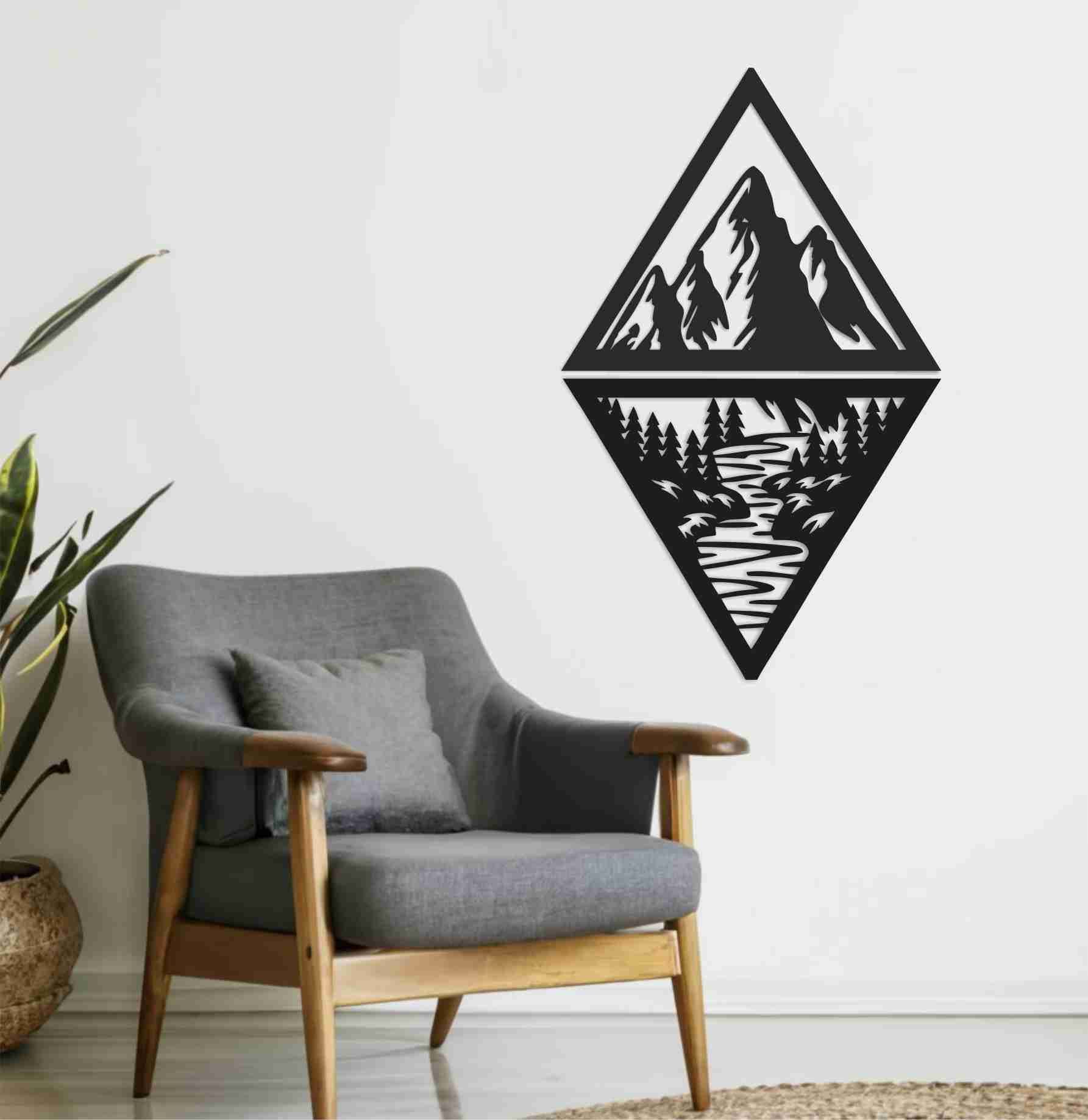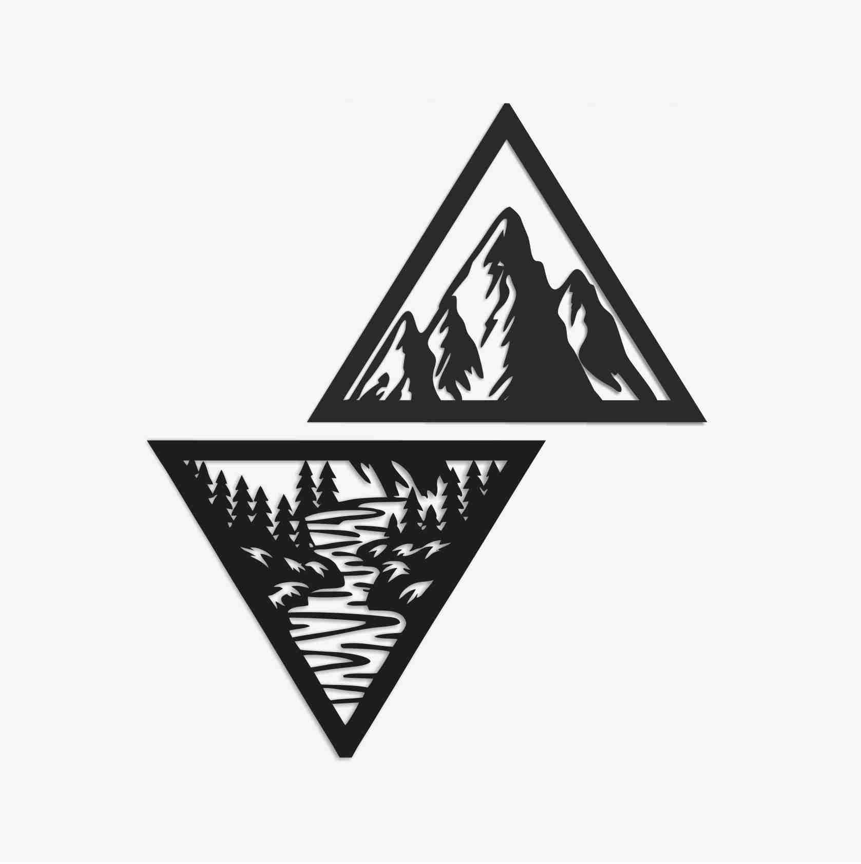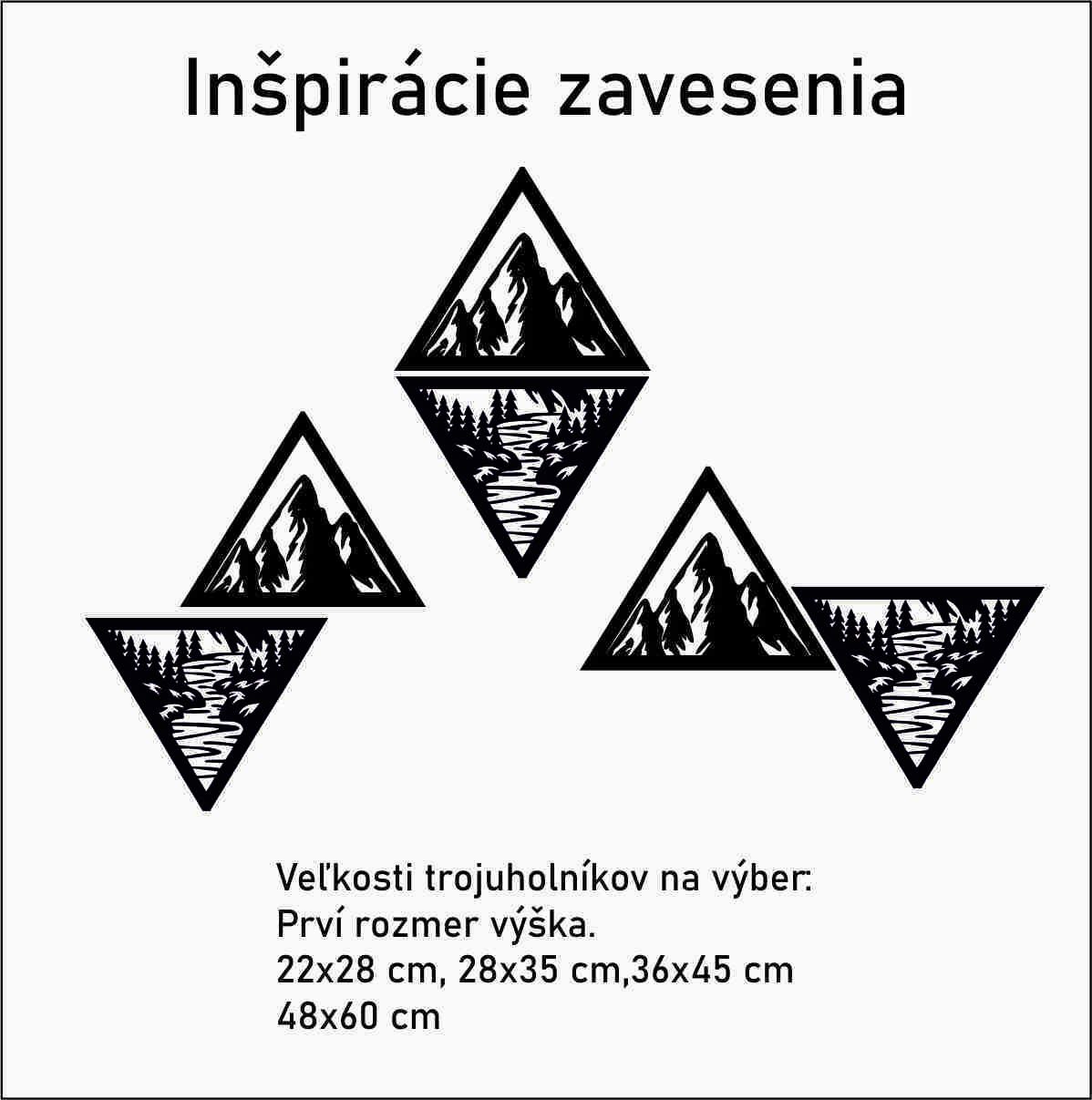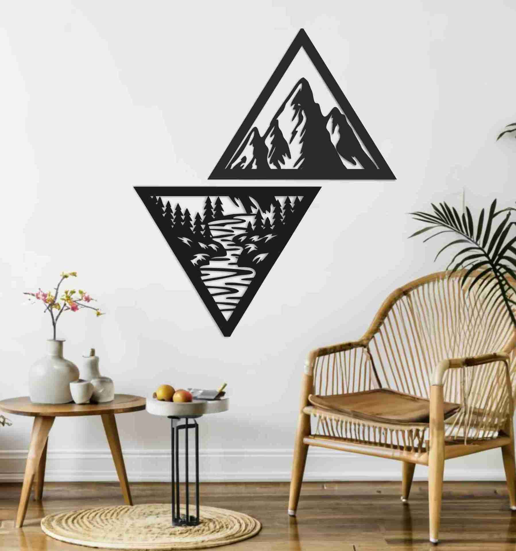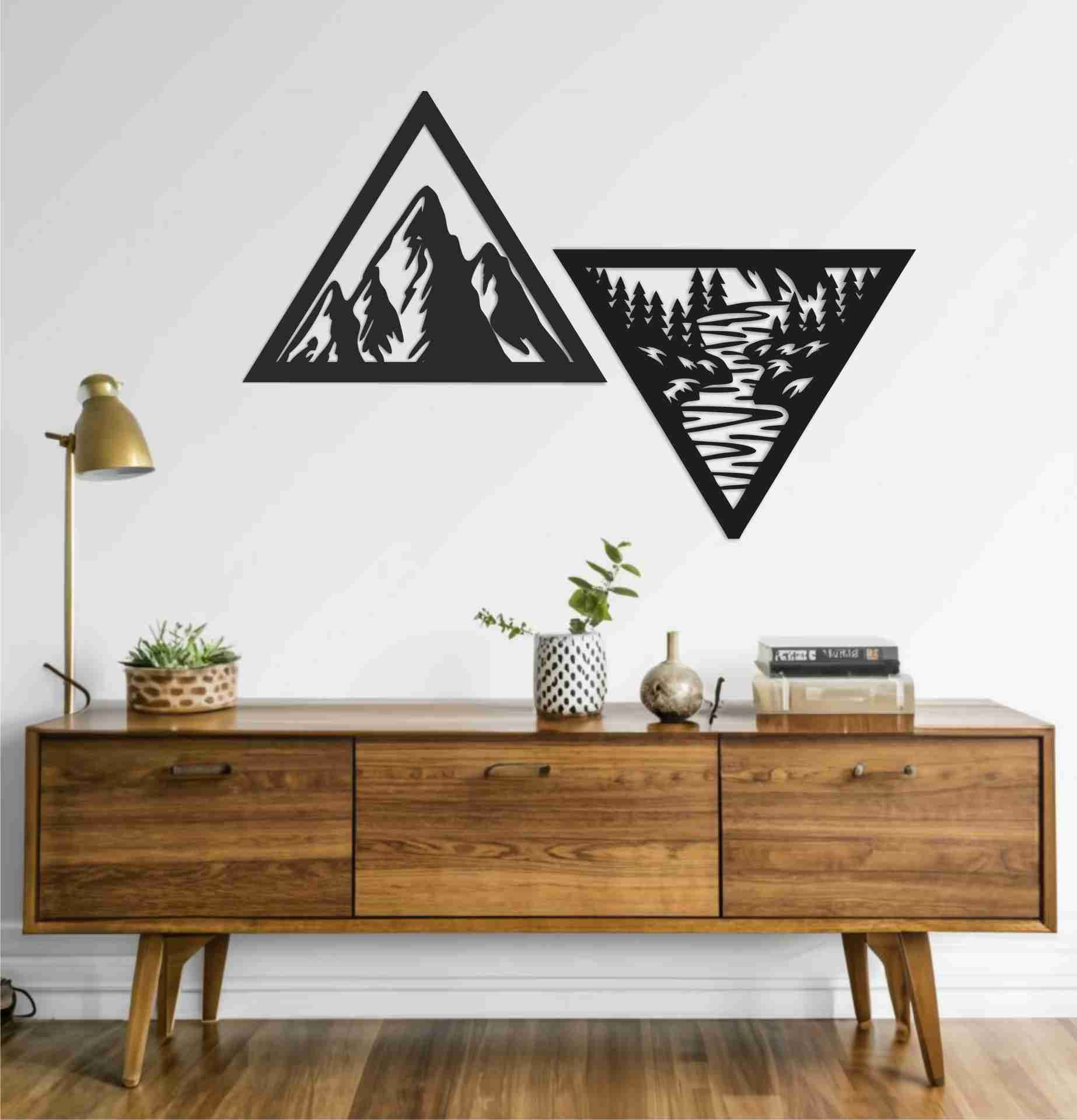 Nástenná drevená dekorácia v modernom štýle silueta hory, lesa a tečúceho potoka v trojuholníkoch. Dvojdielny drevený obraz prírody. Dekorácia pre skrášlenie každej steny, alebo ako darček.