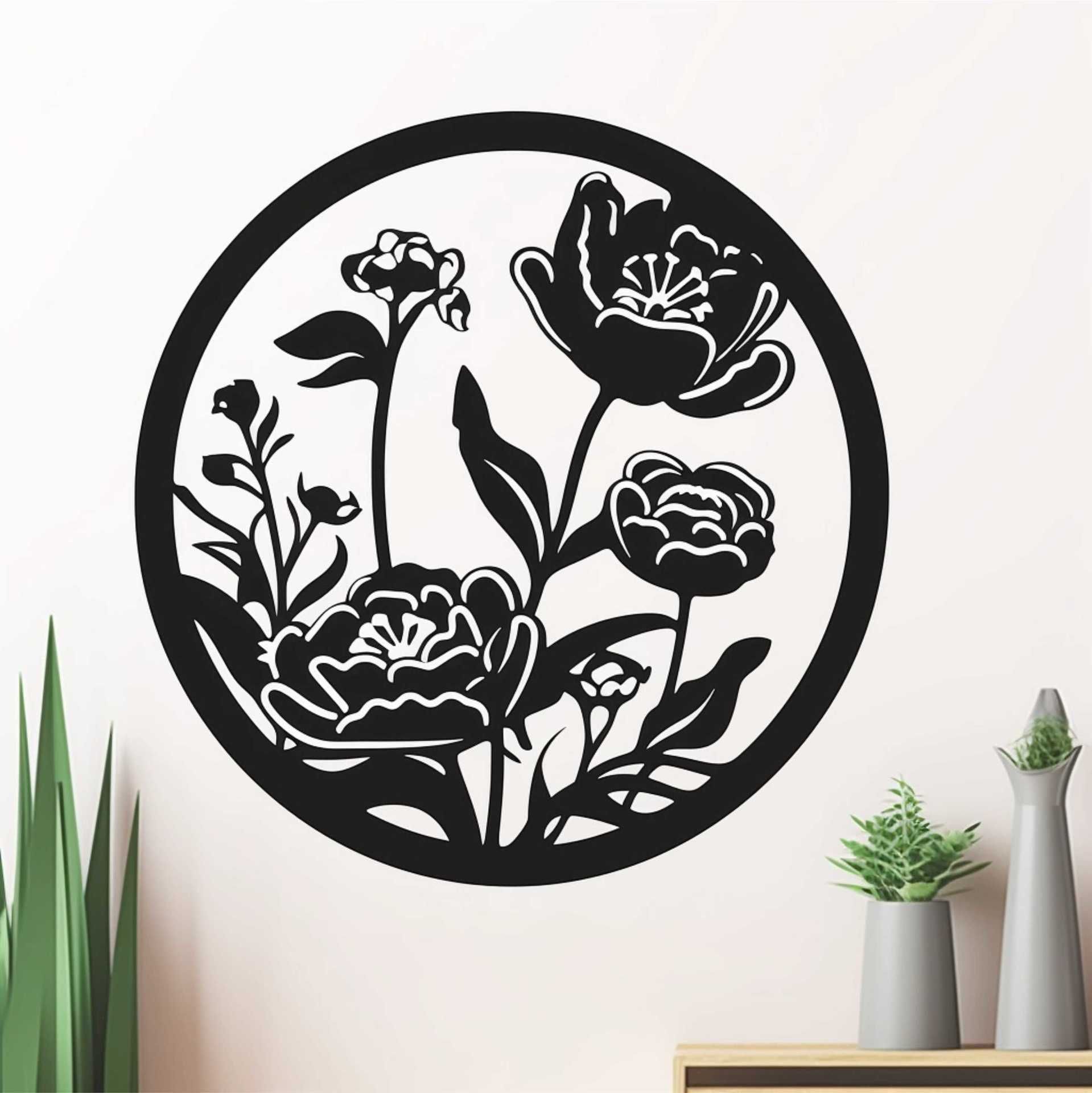 Silueta kvetov v kruhu drevený vyrezávaný obraz na stenu.
