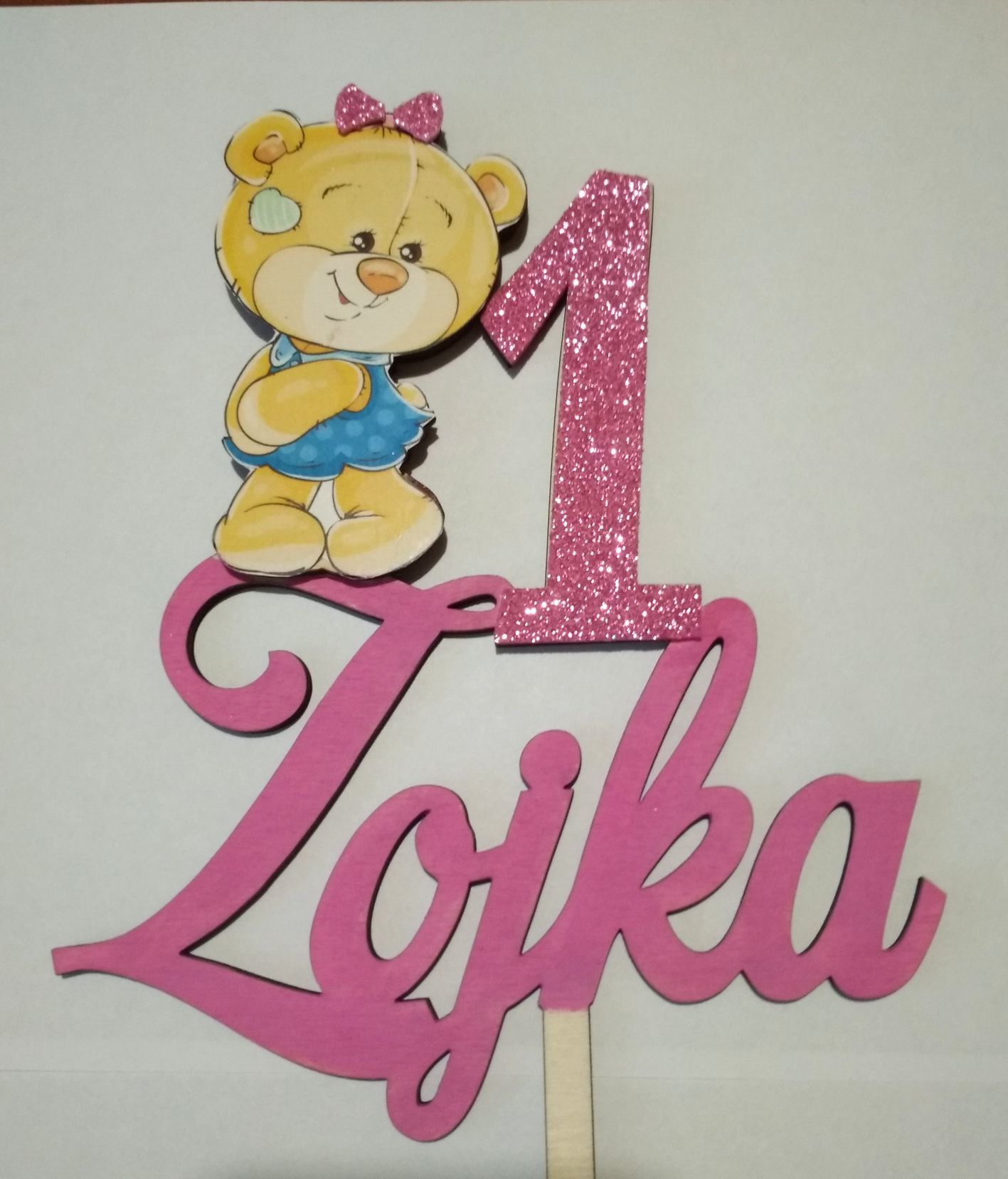 Dekorácia drevená na tortu s menom + číslom medvedikom 1
