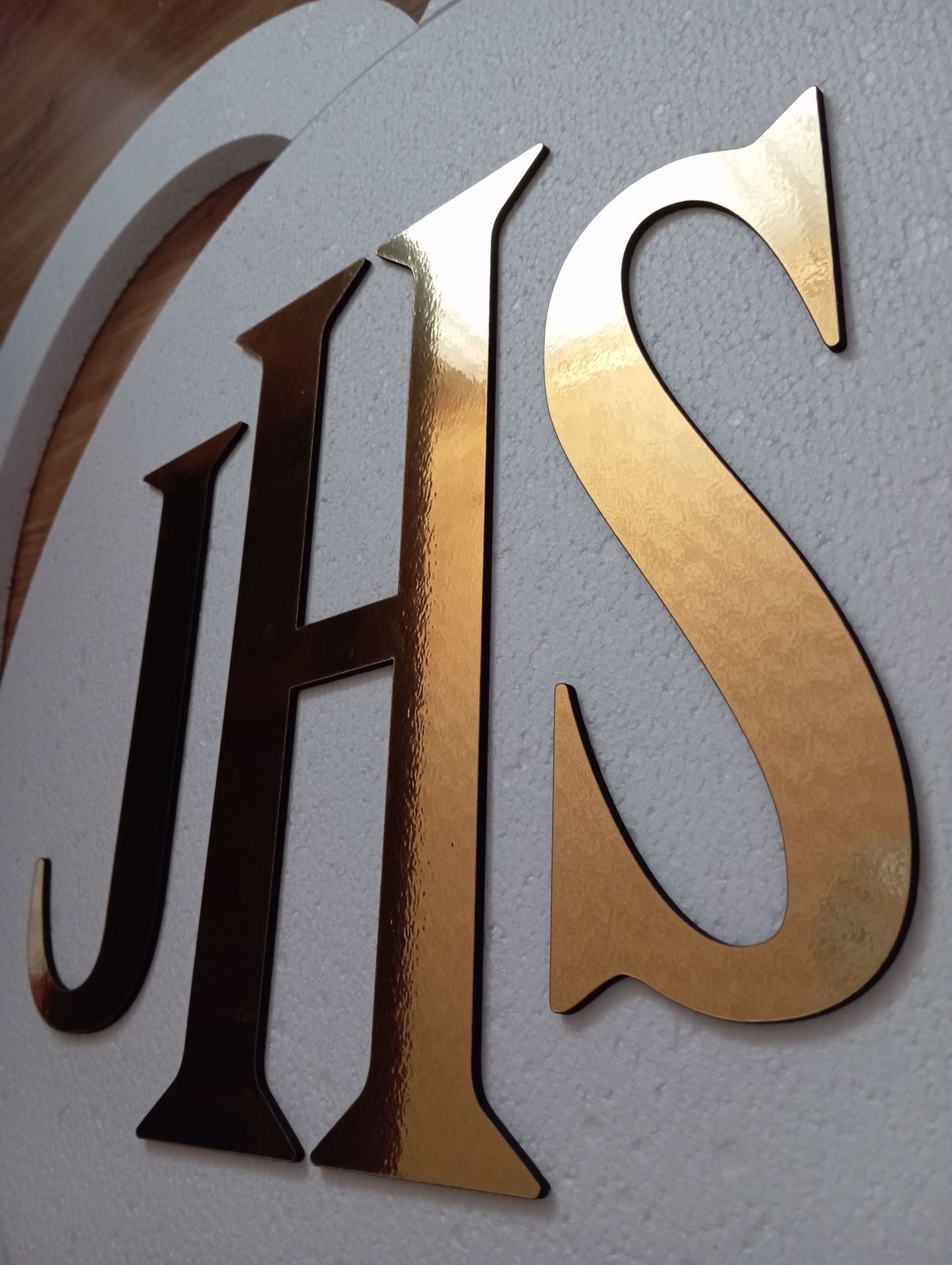 Kombinácia nápis z 3mm MDF + zlatá folia.